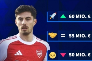 哈弗茨本赛季饱受伤病困扰,在英超只有5次出场,送出1次助攻。目前哈弗茨德转身价5500万欧,德转给出其更新后最高身价可能升至6000万欧,最低则会跌至4500万欧。