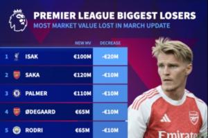 英超跌幅榜:伊萨克跌2000万欧,萨卡、厄德高等8人跌1000万欧