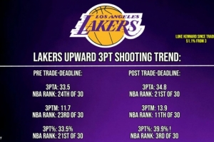 交易得到肯纳德后:场均出手34.8次(联盟第21),命中13.9记(第11),三分命中率39.9%(第3)