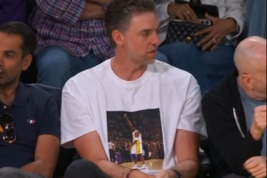 湖人名宿大加索尔来到现场观战,身上穿着一件印有科比81分庆祝动作的T恤。