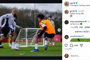 15岁的JJ·加布里埃尔是曼联青训最耀眼的新星,昨晚他在Instagram晒出自己跟随一线队训练的照片,并写道:“足球是我的生命。”