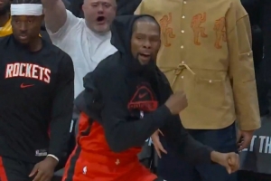 GIF-杜兰特跳进场内庆祝谢泼德扣篮